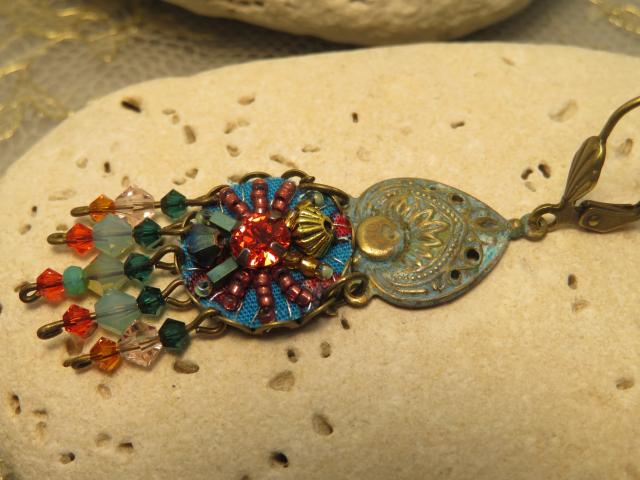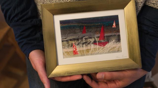She presents in her workshop paintings in assembly of re-embroidered fabrics of materials used in Haute Couture, representing colorful and dreamlike landscapes, whose delicacy can recall the Japanese art she has always been fond of.
