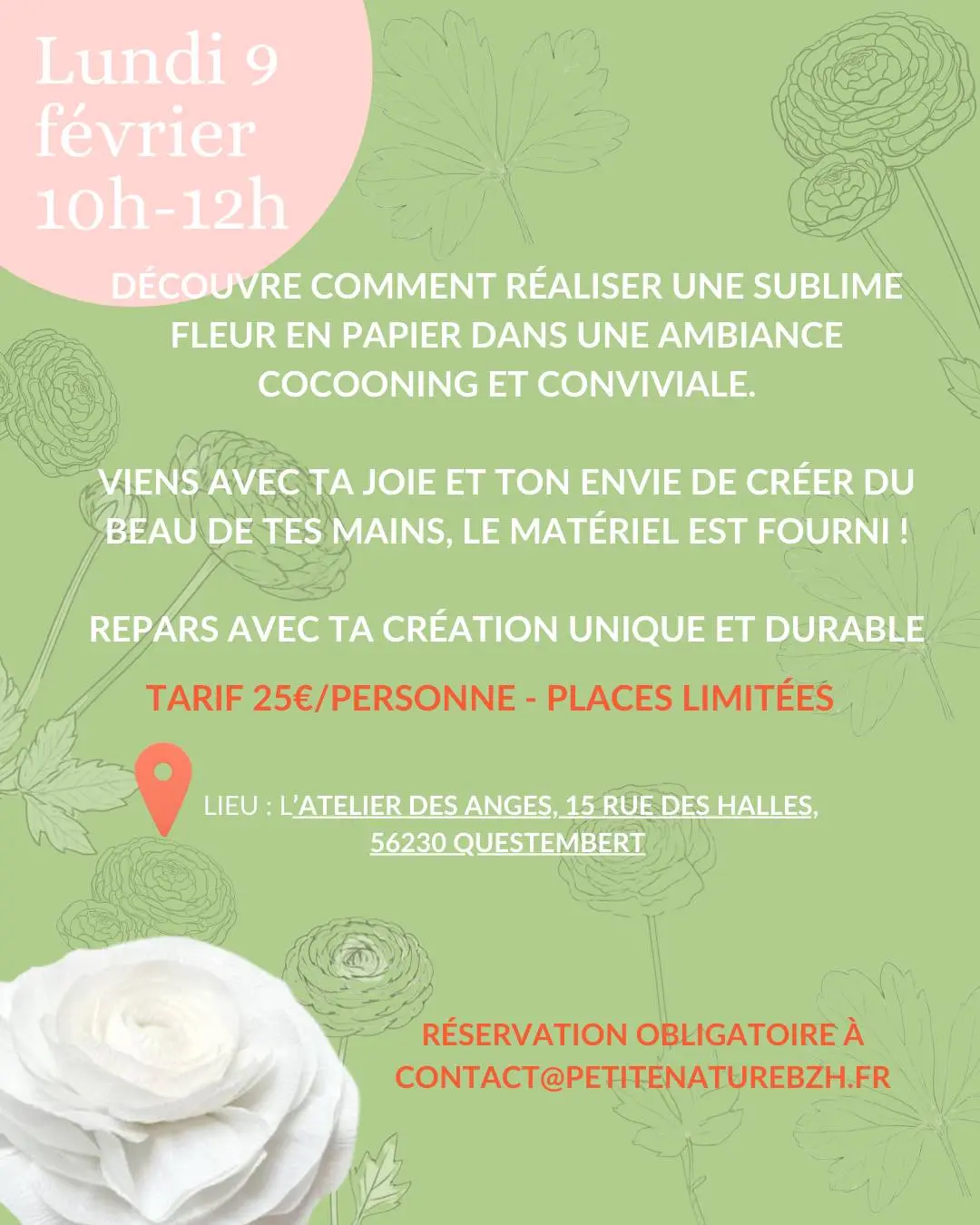 Discover how to create a stunning paper flower in a cozy and friendly atmosphere. Come with your joy and your desire to create something beautiful with your own hands. Materials are provided. Leave with your unique and lasting creation. Reservations required - limited places available! Discover the world of Petite nature bzh, a creative paper flower art company in Morbihan, Brittany. "All my paper flowers and plants are handmade according to your wishes. I draw my inspiration from the shapes, colors, and emotions that nature offers me. Then comes the delicate art of creating paper flowers, limited only by our imagination. Let yourself be carried away by the pleasure of holding beauty in your hands."