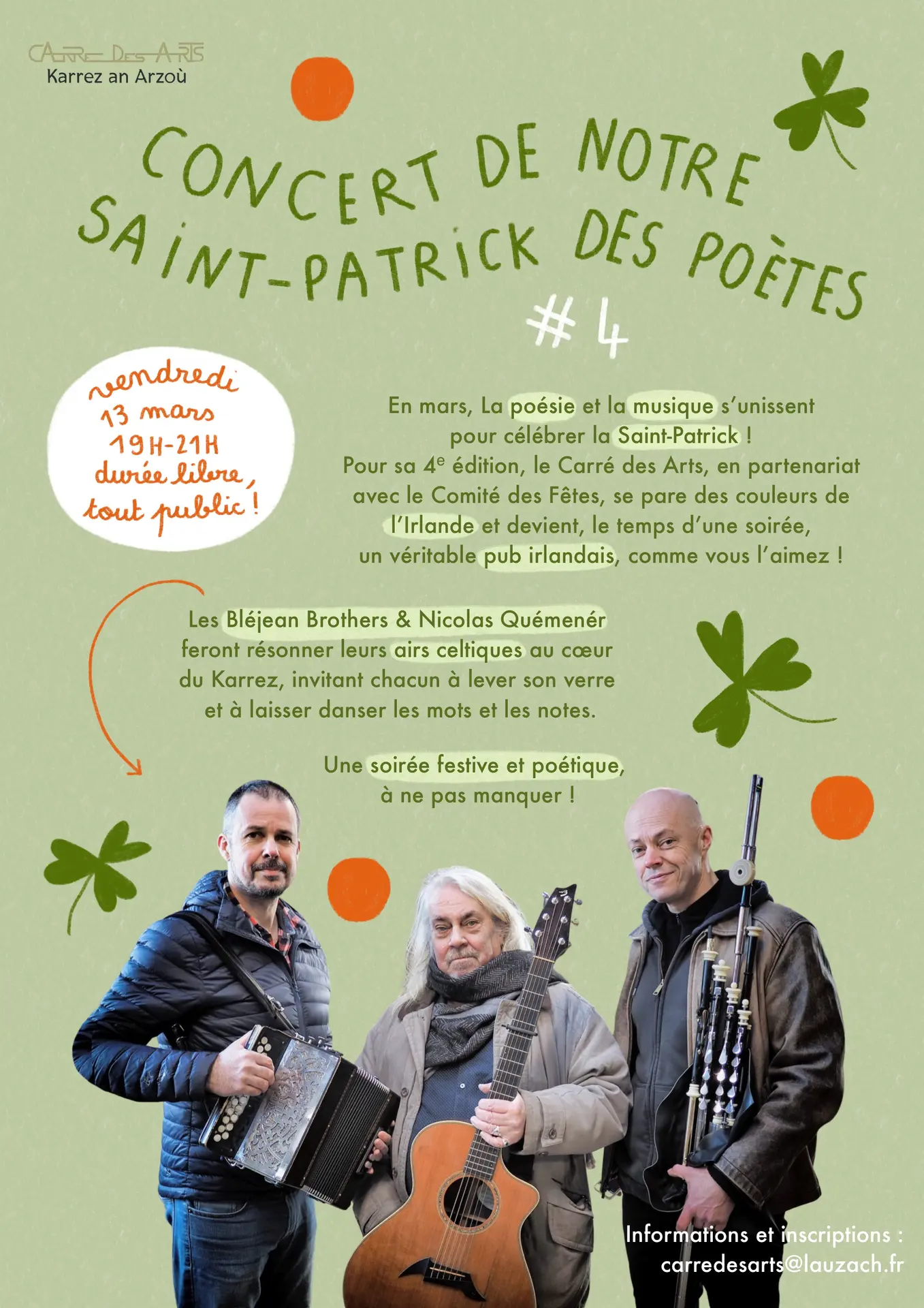 For its 4th edition, the Carré des Arts, in partnership with the Festival Committee, will be decked out in the colors of Ireland and transformed, for one evening, into a true Irish pub, just the way you like it! The Bléjean Brothers & Nicolas Quémenér will fill the heart of the Carré des Arts with their Celtic tunes, inviting everyone to raise a glass and let the words and music dance. A festive and poetic evening not to be missed! Open to all ages. All activities are sponsored by the town of Lauzach. Follow the Carré des Arts on its Facebook page.