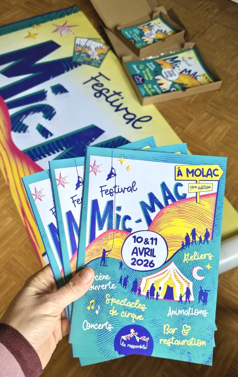 After months of preparation, the "Mic Mac à Molac" festival comes to life for a weekend brimming with music, laughter, acrobatics, encounters, and surprises. Organized by the La Rassemble association. Under a circus tent, incredible artists, a warm atmosphere, delicious meals, and the perfect opportunity to celebrate the arrival of spring together. With family or friends, come share this grand celebration and leave with a smile on your face, a light heart, and stars in your eyes. On the program: all ages welcome - under the big top (limited capacity, reservations recommended) + Friday, April 10th, from 6:00 PM: From 7:00 PM: "Gourmet" Food Truck (burgers). 8pm-9:30pm: Open stage 9:45pm: Free concert "BBT and LOS MEXICANOS" / jazz, rock, bossa nova + Saturday, April 11 from 10am: 10:30am-12pm: Drawing workshop for 6-12 year olds with Virginie Gueutal: "The circus of the future" 10am-12:30pm: Painting workshop around the Exquisite Corpse (from 15 years old) with Nadja Holland These two workshops offered by L'atelier des lucioles are free. Pre-registration required by email at contact@latelierdeslucioles.fr. Then, starting at 2 PM: 2 shows (ticketed) 3:00-3:45 PM: Une corde a vécu by Cie Duo Pendu (all ages) / mime, humor, acrobatics 5:30-6:15 PM: Ce sera pire après by Cie La 3 et demie (all ages) / circus and absurdist theater + 1 musical evening: 2 concerts + 1 DJ (ticketed) 8:30 PM: Alizarina / world electro 10:30 PM: Tago Mago / psychedelic rock, progressive jazz Midnight: DJ Dupont / pop, rock, disco, electro Delicious crepes to enjoy all day. The traditional Rassemblets menu in the evening with desserts from “Ganache Création”. Refreshments available all weekend! And many other surprises! Limited capacity: reservations strongly recommended for the shows and the musical evening. Get your tickets at preferential rates on the HelloAsso website by clicking the "book" link on this page. Cash payment preferred. Dogs are kindly requested not to party on the premises. Camping is available on site (van, tent).