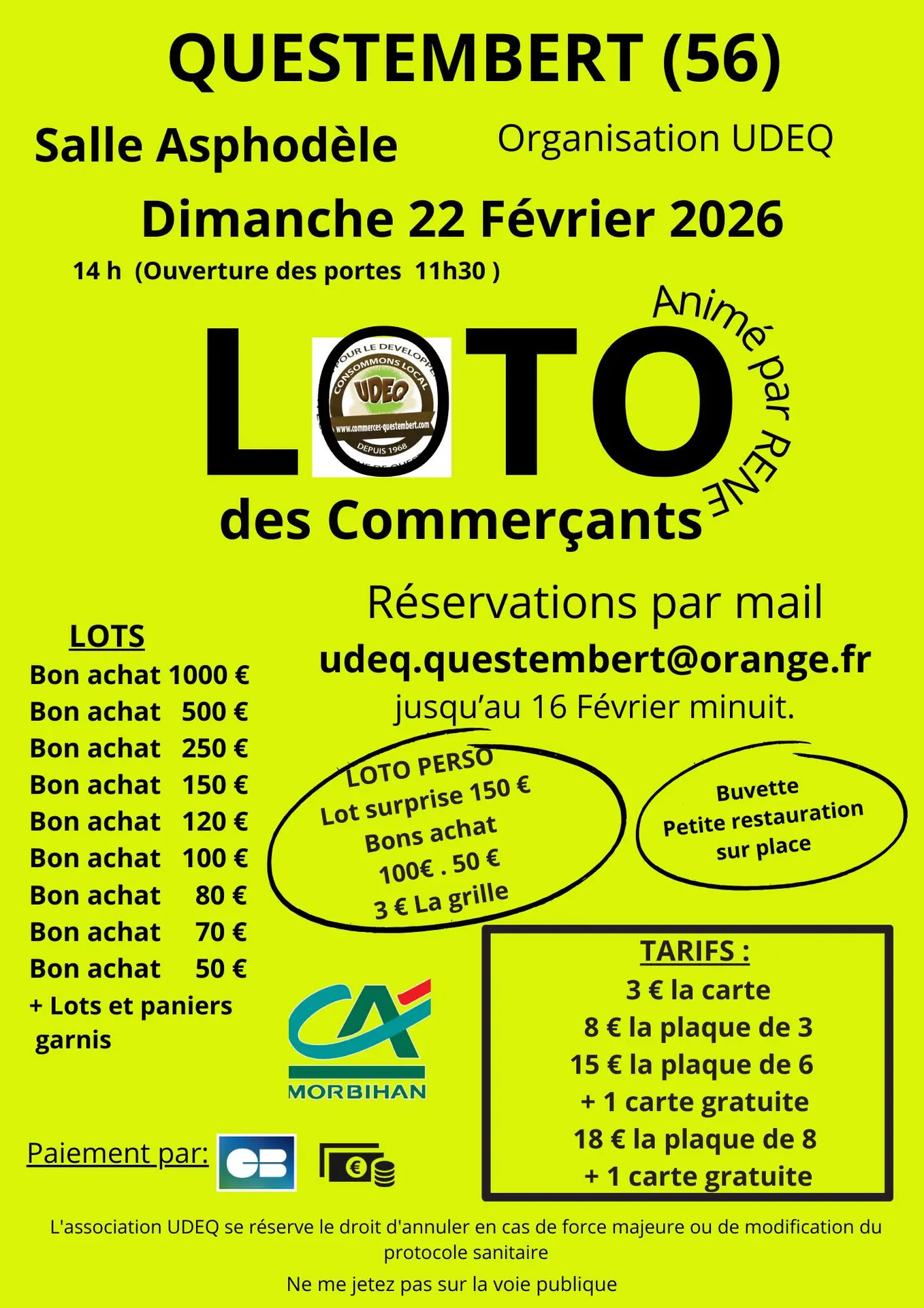 Doors open at 11:30 AM. Over €5,000 in prizes and gift certificates. Organized by UDEQ, the Questembert merchants' association. Refreshments and light meals available. Reservations by email until midnight on February 16th.