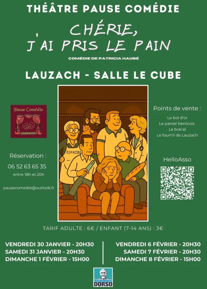 Theater performances. Friday, January 30th at 8:30 pm, Saturday, January 31st at 8:30 pm, Sunday, February 1st at 3 pm, Friday, February 6th at 8:30 pm, Saturday, February 7th at 8:30 pm, Sunday, February 8th at 3 pm. Come and discover "Darling, I Took the Bread" by Patricia Haube. A comedy full of misunderstandings: a missing husband who reappears, a skeleton found, a clumsy inspector, an intrusive cat… in short, hilarious situations that promise plenty of laughs! You can now book your tickets on Hello Asso by clicking the "book" button.