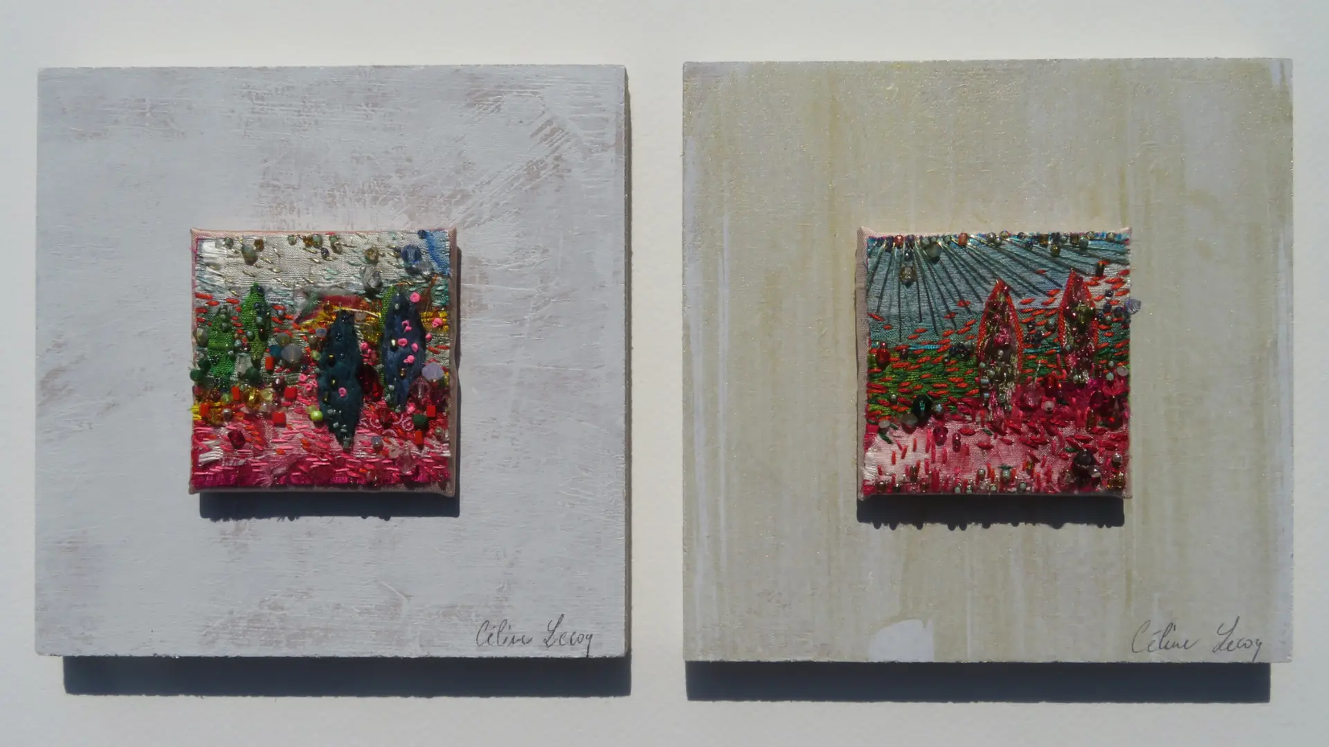 An embroidery designer for haute couture, Céline Lecoq creates small paintings in her boutique where she depicts dreamlike and colorful landscapes in assemblages of embroidered fabrics. You can also discover her jewelry and her paintings (watercolors). Céline attended the Duperré school, a school of visual arts in Paris where she then worked. She worked in embroidery for haute couture, Chanel, Christian Lacroix, Dior to name just these three greats. But she has several strings to her bow, such as painting or the creation of embroidered jewelry (brooches, pendants, bracelets) -> https://celinelecoq.wixsite.com/atelier-bijoux Workshop open all year round, but different opening days depending on the month. Call to find out the opening days of the current month (or send an email). Follow Céline's news on Facebook! Discover her work on the L'Atelier Sensible website. My embroideries are on sale in my shop at 12 rue Porte Cadre, and at the Maison des ARTisanes (14 rue Notre Dame de la Tronchaye)