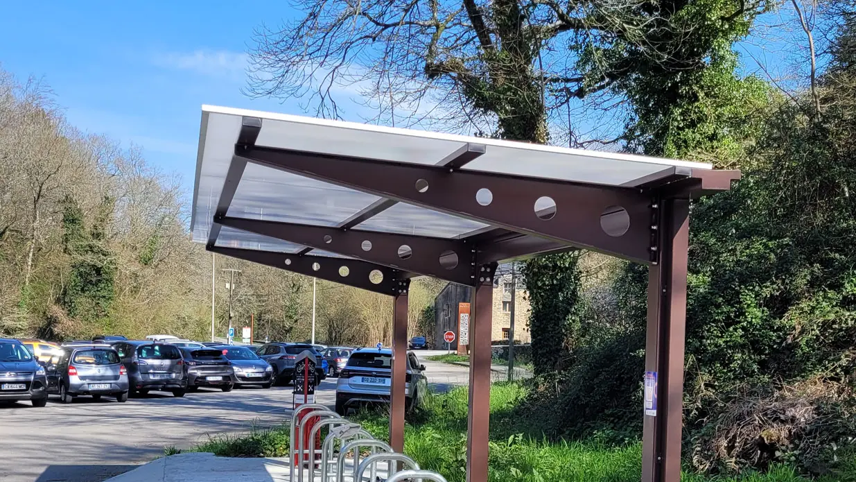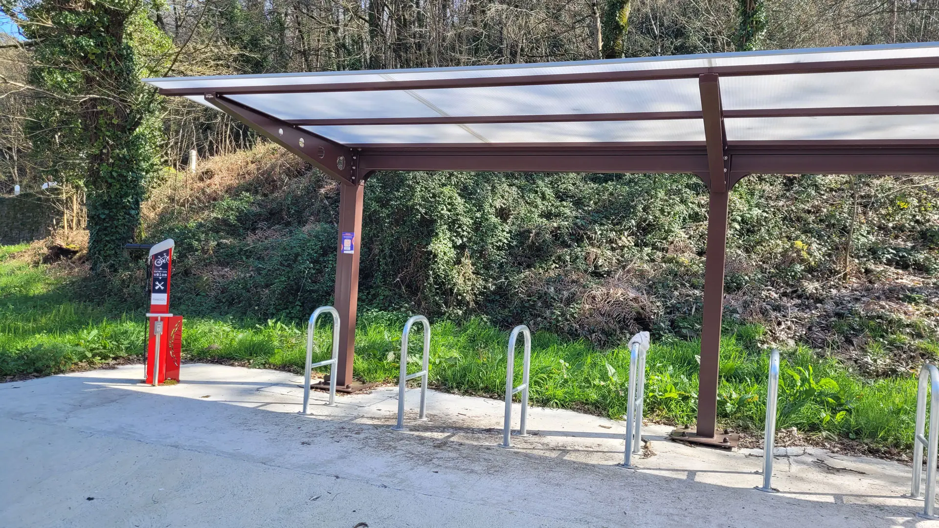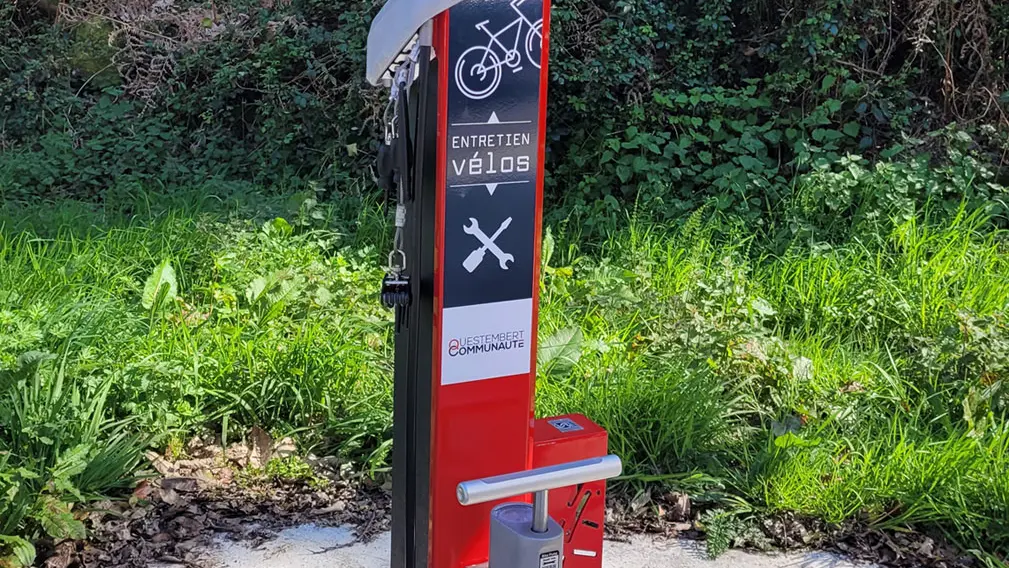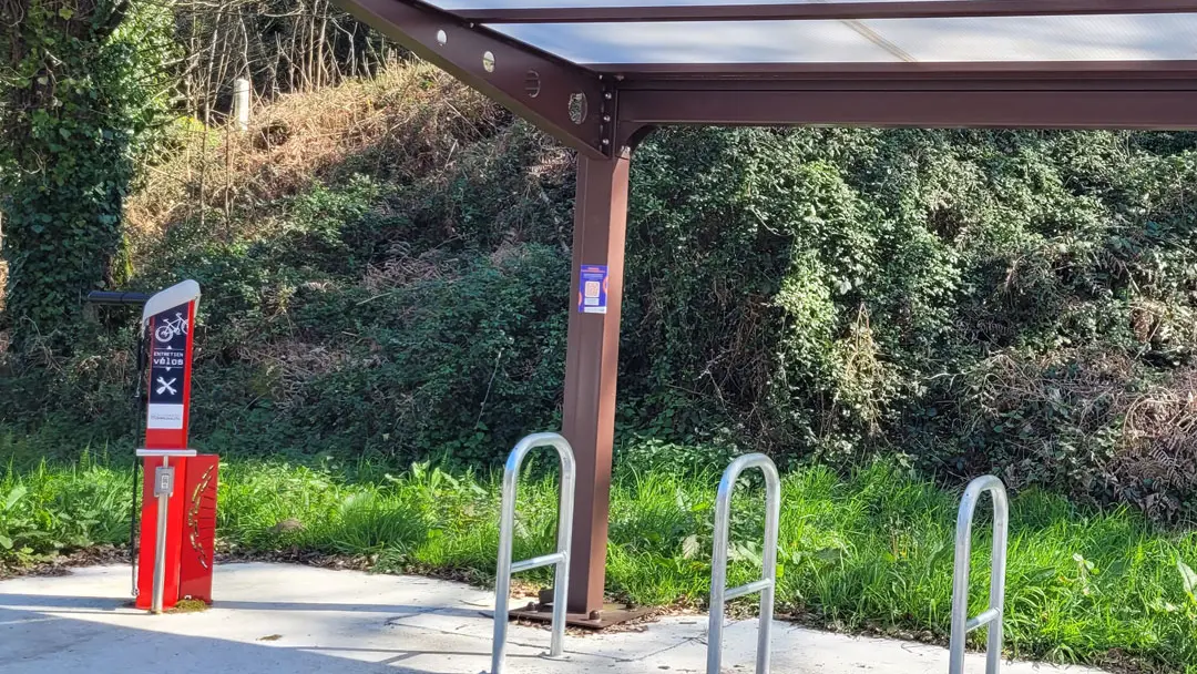 This station, located in the Moulin Neuf parking lot, is equipped with a shelter, bike racks, and a self-service repair station with all the necessary equipment. The station offers a variety of tools adapted for bicycle repairs. This includes: - A stand to hang your bike at a comfortable height, making repairs easier! - Numerous tools: Allen key set, T-25 Torx key, tire levers, crankset wrench, 8/10 mm and 9/11 mm open-end wrenches, and screwdrivers - An air pump with a pressure gauge. - A temporary bike docking station that secures the bike by the front wheel. This station was funded by Questembert Communauté.