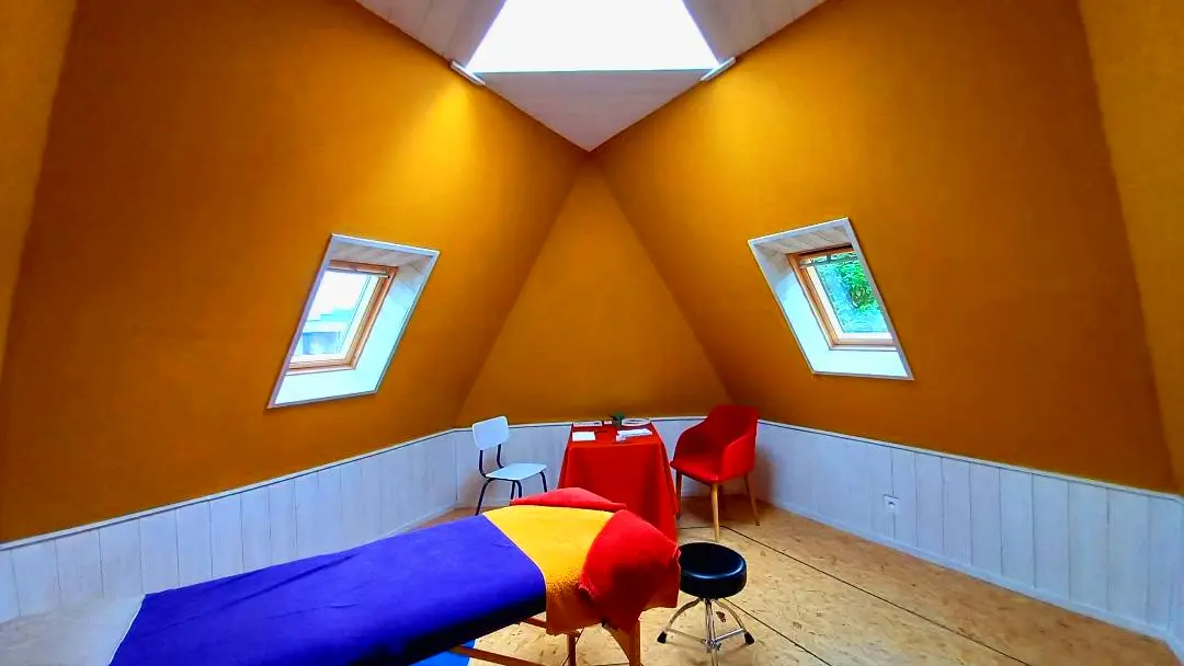 A session of plantar reflexology: from the celestial vault to the earth plane vault. Artist and Wellness Coach, Geoffrey offers sessions of Plantar Reflexology with a psycho-emotional approach, in his self-built office in sacred geometry in Questembert.