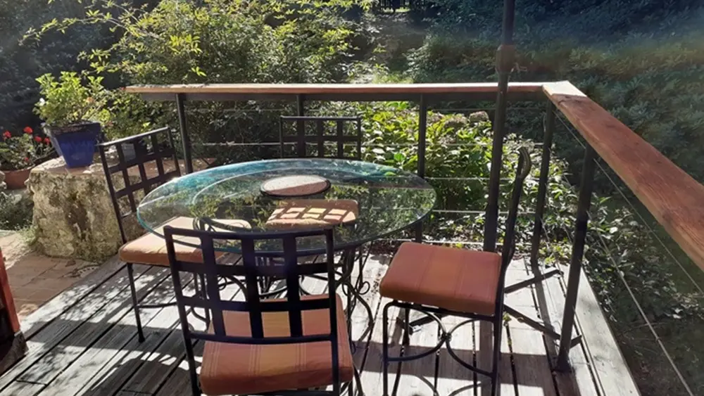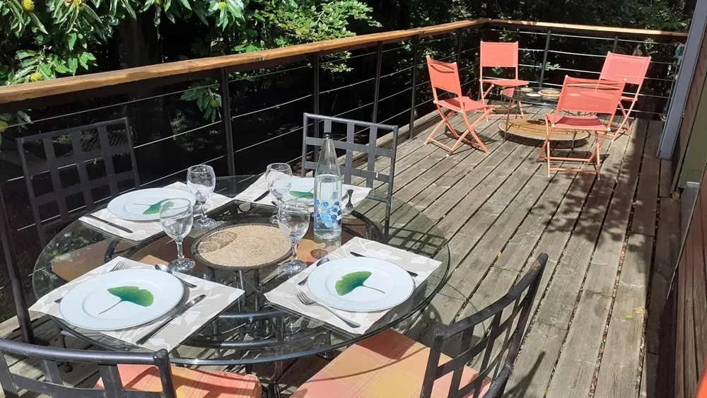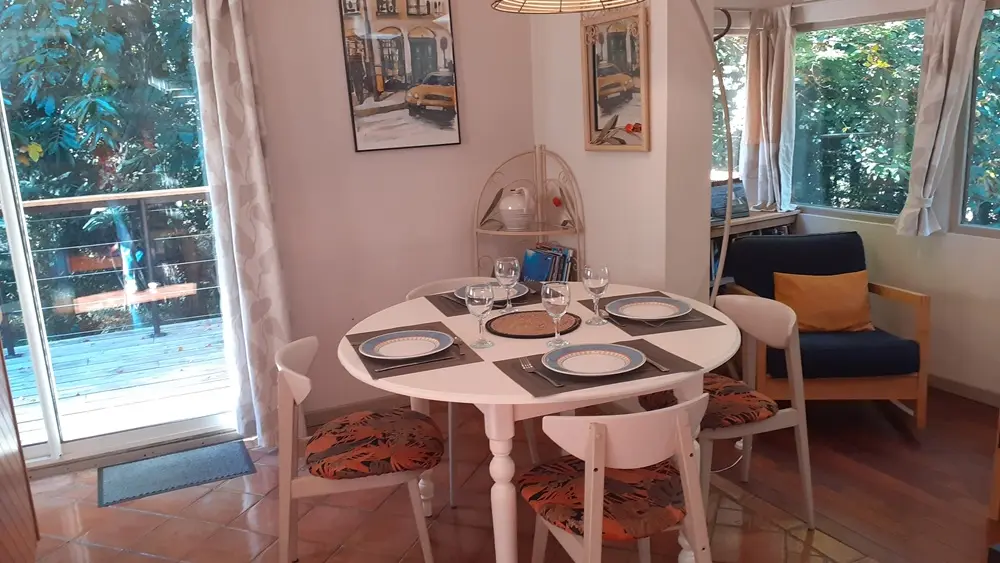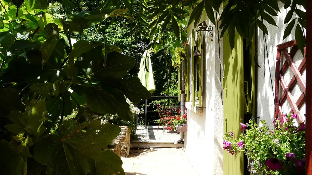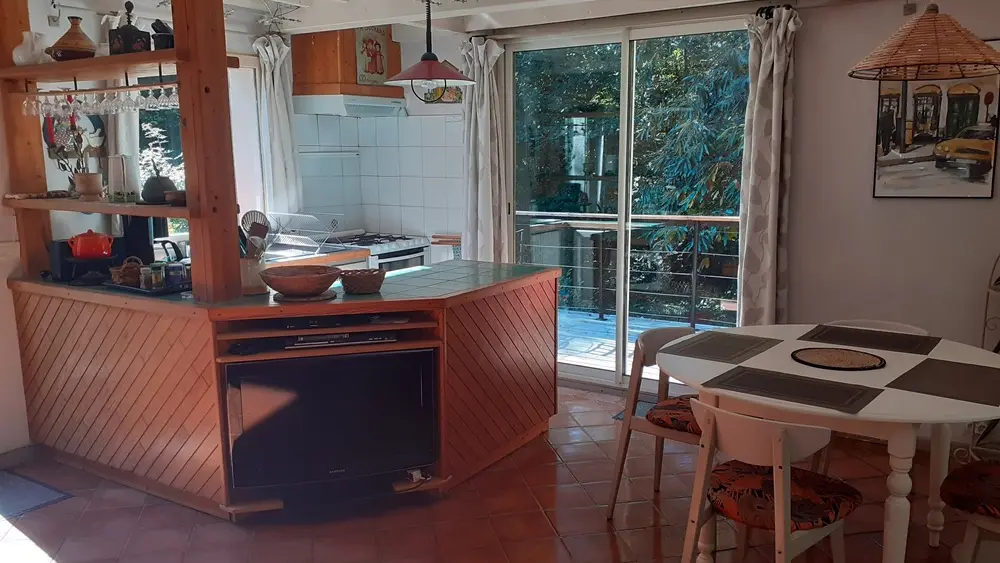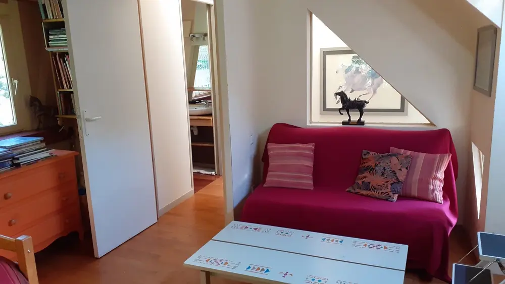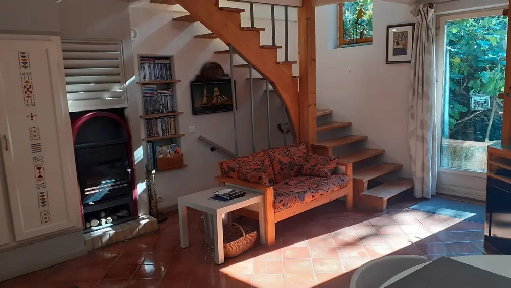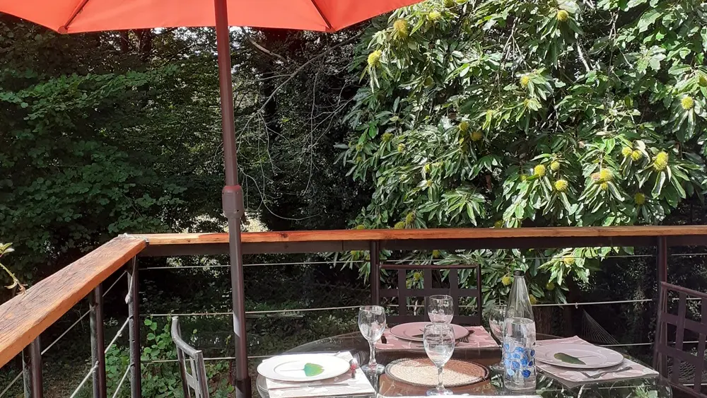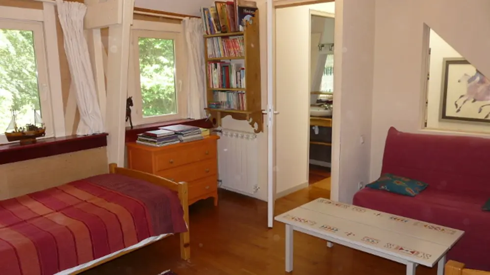 Hiking trails and a lake in the immediate vicinity, facilities and games for children Located on the edge of a wood, in a wooded garden, the Carguillet gîte offers a space of calm and relaxation, 3 km from Rochefort-en-Terre and less than 30 minutes from the seaside. Very bright, it is spread over 3 levels and extends to the west by a terrace overlooking the woods and the valley. Adjoining the owners' house, the gîte has a separate entrance and an independent garden area of approximately 2000 m2, including a wooded area. The bedroom on the ground floor opens onto a second shaded terrace, very cool in summer. In an enclosure adjoining the gîte's garden, our very familiar dwarf goats will delight children. 500 meters on foot: the Moulin Neuf pond and its leisure center, with playground, treetop adventure course, escape game and equipment rental (pedal boats, bikes, rosalies...), bowling greens, tennis courts with free access. In the immediate vicinity: several hiking trails in a forest and hedged environment. On site: numerous facilities and equipment for children - zip line, swing, ping-pong table, badminton net. For evenings or rainy days: board games, books, comics, DVDs.4 A tourist tax will be requested on site (per person per night), its amount varies depending on the type and classification of the accommodation. Inquire.