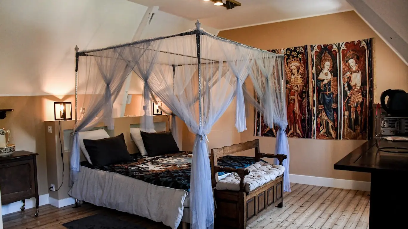 The Manoir de Menglieu is located 600 meters from Treffléan and 12 km from Vannes. This Manor, with its architecture as well as its park to the south and its forest to the north over more than 1.1 hectares, is the ideal place for a stay in bed and breakfast. The 4 rooms are located upstairs under the theme of the Arthurian legend. We offer table d'hôtes and picnic baskets. A tourist tax will be requested on site (per person per night), its amount varies depending on the type and classification of the accommodation. Inquire.