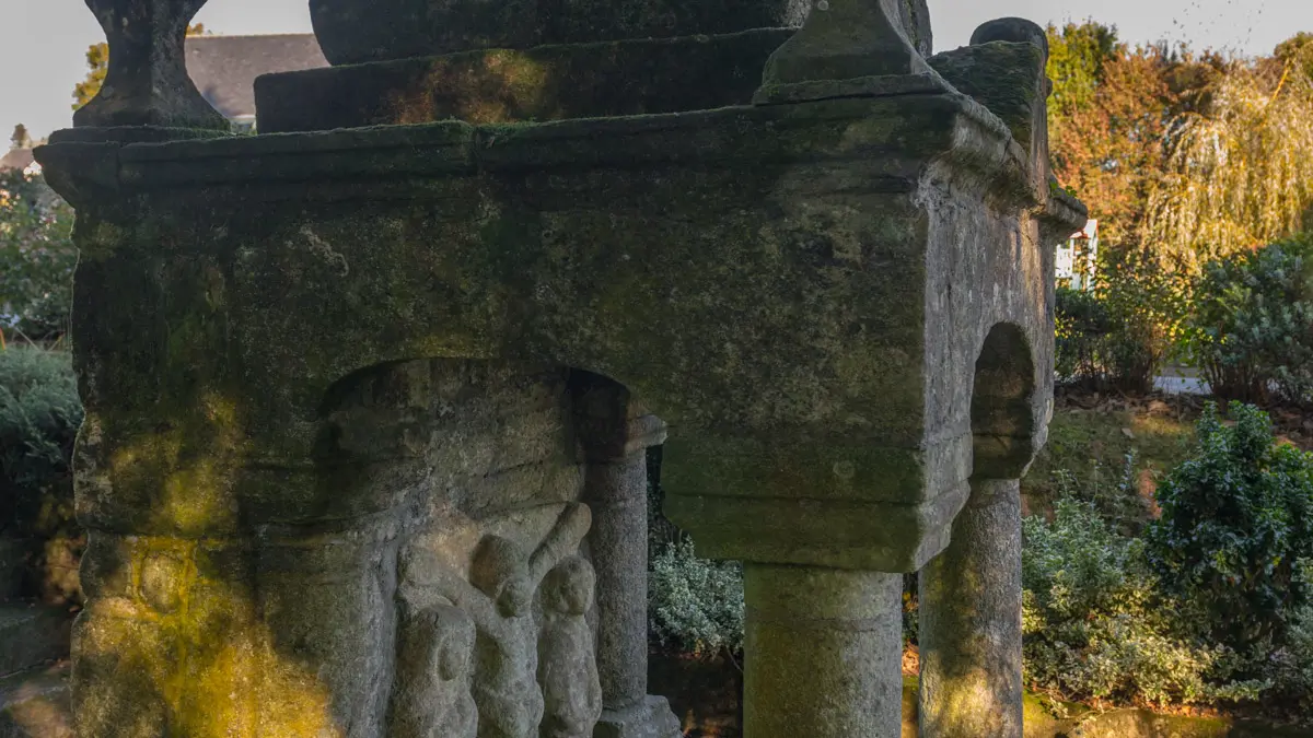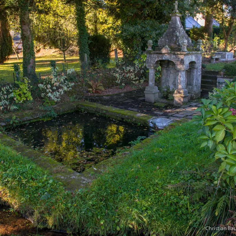 Building protected as a Historic Monument, registered by decree of January 15, 1929. It is located in the center of a stone paving bordered by small low walls and to the east by a large basin that has long served as a washhouse. This fountain has the shape of a small oratory. Its 4 cylindrical columns, with square bases and capitals, are surmounted by basket-handle lintels that support a pyramid topped with a cross and confined at each corner by a ball baluster. Unlike the usual niche with a statue, the back wall is decorated with a crucifixion scene.